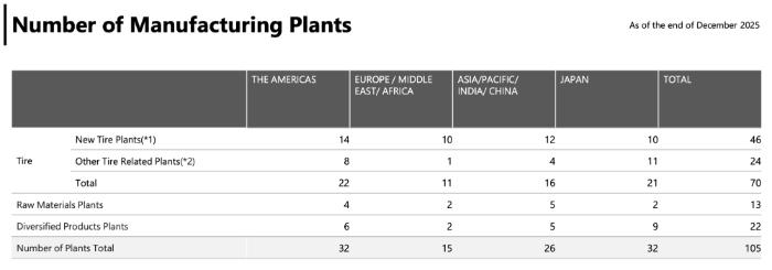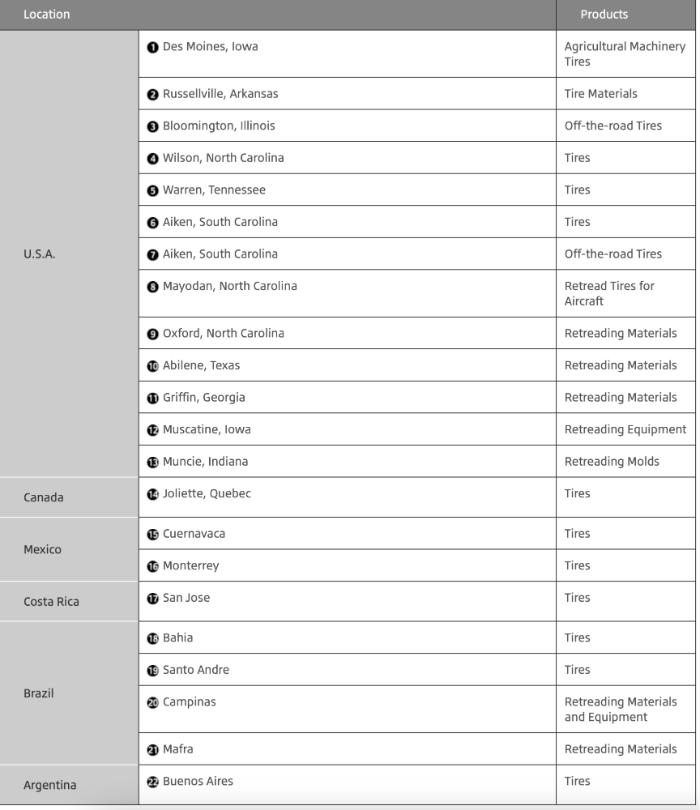 Within the US, plant locations include Abilene, Texas; Akron, Ohio; Bloomington, Illinois, among many others. Each facility is responsible for a specific type of tire production. Refer to the chart shown above for details.