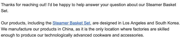 In contrast, the steamer basket product page did not provide such information. To verify, we reached out directly to the company. Here is their reply: