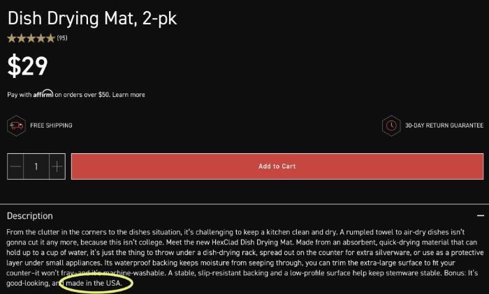 We searched their website for products made in the USA and found two items: a dish-drying mat and a steamer basket set. Right on the drying mat product page, we found an affirmation that it is made in the USA.