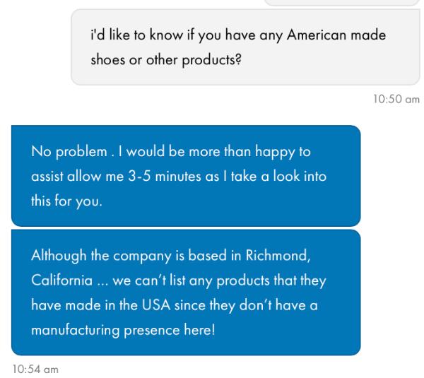 After checking the website, we still wanted to know for sure if there were any US-made items in the Hoka lineup. We jumped into a live chat with their customer support team to ask. Here is that conversation: