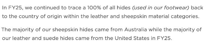 The above statement is from the Deckers sustainability report, which includes leather-heavy brands like UGG. Hoka shoes typically don’t include leather and therefore don’t include much US-sourced material. There are some exceptions, however, like the Hoka Bondi SR, a recovery shoe.