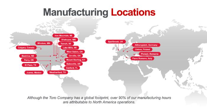 Granted, all products we scoped were either labeled with USA or Mexican origins, and we found no products from other countries. Mexico is still within the North American footprint, and according to Toro’s manufacturing map linked above, 90% of manufacturing hours occur in North America.
